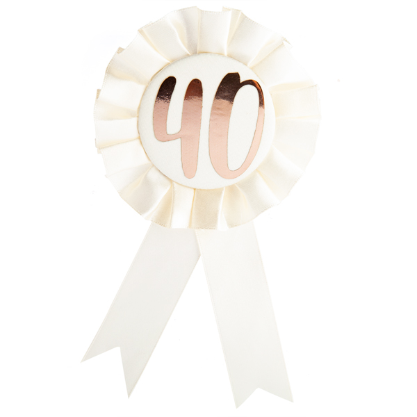 White/cream rosette ribbon with rose gold 40 on the front. Rosette measures approx. 9.5cm in diameter and ribbon measures approx. 7.5cm in length (measured from bottom of rosette.)