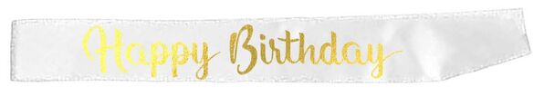 The sash is made from white fabric printed with a stylish gold 'Happy Birthday' message on the front panel.