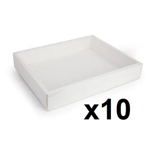 10 x White rectangular cardboard cookie boxes with a clear plastic viewing window, perfect for any baker’s creations! Boxes come flat in pack, but is easily assembled.