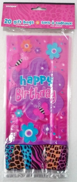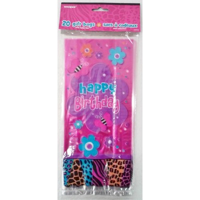 Wild birthday cello gift bags, each measuring approx. 29cm x 13cm. 20 in a pack. Silver twist ties included.