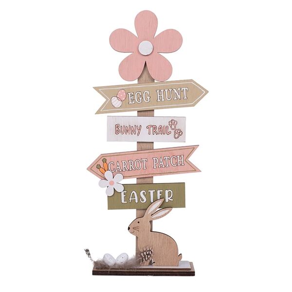 It is made from a quality MDF and depicts a charming signpost giving directions to the Egg Hunt, Bunny Trail & Carrot Patch.