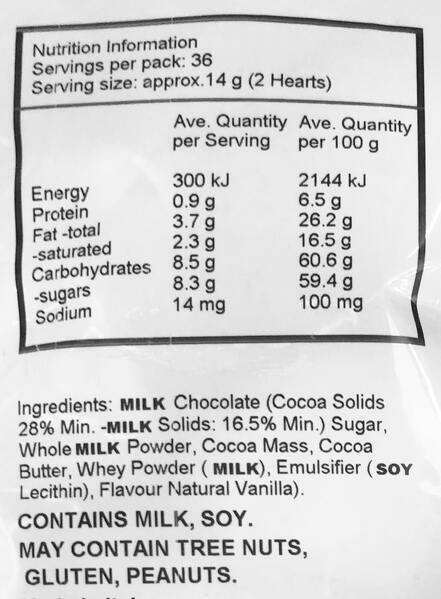 These choc hearts measure approx. 3cm x 3cm and you get approx. 70 per 500g bag.
