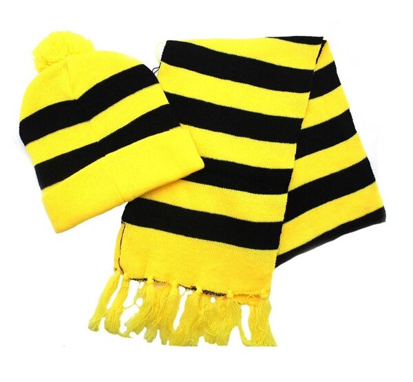 This costume set includes a beanie & scarf made from knitted polyester yarn and featuring horizontal yellow & black stripes and a self-adhesive black moustache..