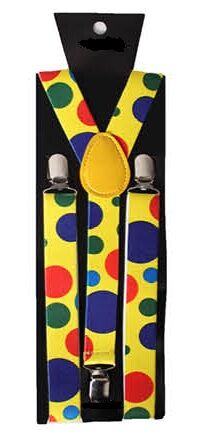 Perfect for clown costumes, circus themes and playful dress-up events & designed to stand out, the bright yellow base combined with colourful polka dots makes these suspenders a must-have accessory for any fun costume.